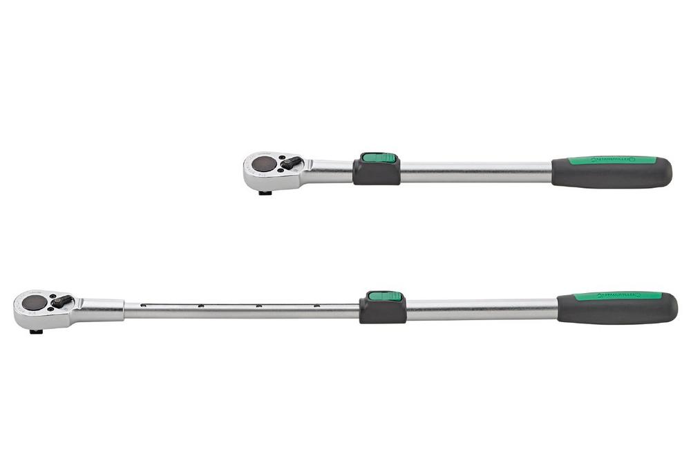 Der Schaft der Knarre kann in fünf Längen von 410 mm bis 630 mm eingestellt werden, das Raster beträgt jeweils 55 mm. Die variable Baulänge erschließt zusätzliche Anwendungsmöglichkeiten, wo der Einsatz einer Knarre nicht oder nur eingeschränkt möglich ist. Der Auszug der Verlängerung läuft mit Gleitlager und Anschlagsicherung schnell und sicher. Die Anpassung der Länge erfolgt komfortabel über eine Schaltwippe am vorderen Schaftende.