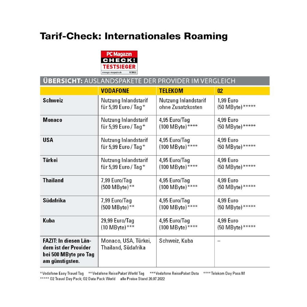 Das Ergebnis: In fünf der sieben verglichenen Länder ist Vodafone bei 500 MByte pro Tag am günstigsten und damit der Testsieger. Gegen einen Aufpreis von 5,99 Euro/Tag können Kunden in der Schweiz, Monaco, USA und Türkei den Inlandstarifs nutzen. In Thailand und Südafrika zahlen Kunden für das „Vodafone ReisePaket World Tag“ 7,99 Euro/Tag für 500 MByte. Nur auf einer KubaReise ist Vodafone mit 29,99 Euro/Tag für 10 MByte im „Vodafone ReisePaket Data“ am teuersten. In der Schweiz ist die Telekom führend: Dort nutzen Reisende dasselbe Datenvolumen wie daheim, ohne Aufpreis. Auch in Kuba ist der Anbieter am günstigsten und bietet mit dem „Telekom Day Pass M“ 100 MByte für 4,95 Euro/Tag an – dieser Tarif gilt auch für die übrigen Länder Monaco, USA, Türkei, Thailand und Südafrika, fällt aber aufgrund des geringeren Datenvolumens gegen die Konditionen von Vodafone ab. O2 ist in fast allen Ländern teurer als die Konkurrenz und erreicht den letzten Platz. Der Anbieter behandelt alle Länder, abgesehen von der Schweiz, in dem vorgenommenen Vergleich identisch: Für das „O2 Data Pack World“ zahlen die Nutzer 4,99 Euro/Tag für 50 MByte, in der Schweiz 1,99 Euro/Tag für 50 MByte.