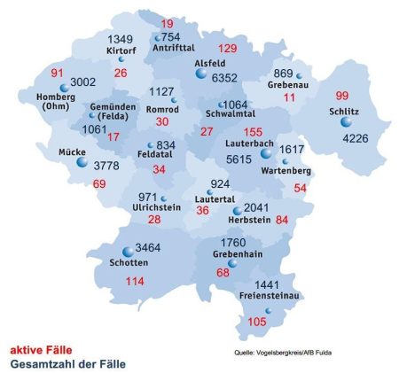40 neue Corona-Fälle meldet das Gesundheitsamt des Vogelsbergkreises am Freitag. 56 Menschen haben sich als genesen gemeldet, sodass die Behörde aktuell 1.196 aktive Fälle betreut. Für das Kreisgebiet weist das Robert-Koch-Institut (RKI) eine Sieben-Tage-Inzidenz von 356,4 aus. In Hessen liegt der Wert bei 276,7. Bei der Sieben-Tage-Inzidenz der Hospitalisierungen meldet das RKI für Hessen einen […]