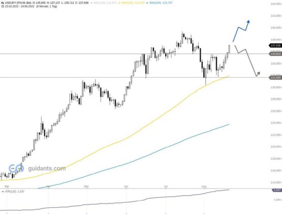 Rückblick Seit der Trendumkehr zum Jahresbeginn 2022 befand sich das Währungspaar USD/JPY zunächst in einem leichten Anstieg, welcher bis Anfang März anhielt. In dieser Zeit stieg der Kurs von ca. 102,60 Yen um zeitweise über 13% auf 116,25 Yen. Danach begann eine regelrechte Rallye, in der das Währungspaar um 21% auf 139 Yen in Mitte […]