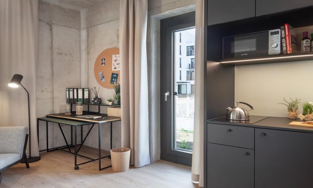 Die Mikro-Apartments sind zwischen 17 und 34 Quadratmetern groß und verfügen über eine eigene Küche und Badezimmer. Darüber hinaus sind sie mit einem erweiterbaren Schreibtisch, Bett mit viel Stauraumoptionen sowie einem Kleiderschrank ausgestattet. Die Möblierung wird für die optimale Raumausnutzung für jedes Apartment individuell angefertigt. Darüber hinaus verfügen viele der 295 Apartments über einen Balkon oder eine großzügige Terrasse.