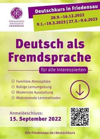 Wir bieten unseren Kurs-Teilnehmerinnen und -Teilnehmern eine familiäre Lernatmosphäre, eine ruhige Lernumgebung auf dem Campus mitten in der Natur, modernste technische Ausstattung sowie interaktive, motivierende Lehrmethoden. Nach Abschluss des Sprachkurses an der ThHF wird eine Teilnahmebescheinigung ausgestellt. Weitere Informationen: https://www.thh-friedensau.de/deutschkurs.