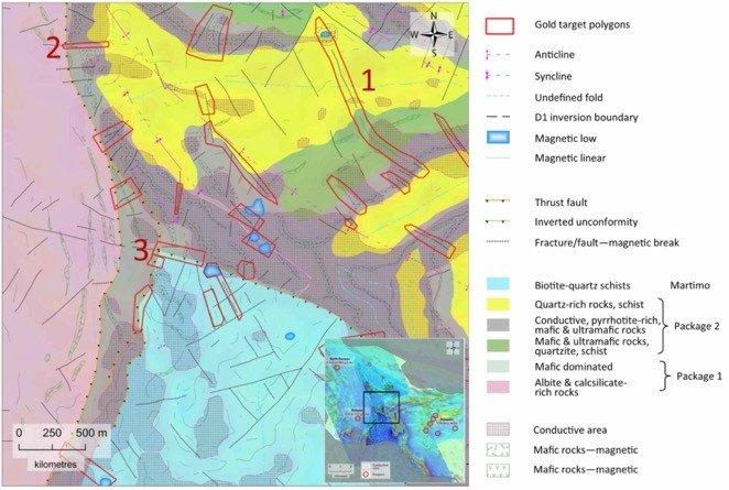Das aussichtsreiche Wirtspaket für die Goldmineralisierung umfasst Metasedimente, mafische und ultramafische Gesteine und Quarzite. Diese Gesteine sind unterschiedlich sulfidisch (Pyrit und Pyrhotit) und zeichnen sich durch magnetische und leitfähige geophysikalische Eigenschaften aus. Von besonderer Bedeutung ist die Kartierung von Verwerfungen und Falten, vor allem dort, wo Verwerfungen das aussichtsreiche Wirtsgestein durchschneiden – dies sind die Stellen, an denen Gold am wahrscheinlichsten abgelagert wird ("Ziele").