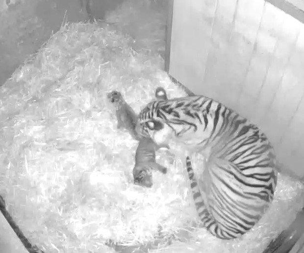 „Wir haben im Tierpark das Glück ein hochprofessionelles Team aus Tierärzt*innen, Biolog*innen und erfahrenen Tierpfleger*innen zu haben, die sich an 365 Tagen im Jahr um ihre Schützlinge kümmern. Aber bei der Aufzucht des Tiger-Nachwuchses ist tatsächlich größte Zurückhaltung gefordert – wir sind zuversichtlich und vertrauen auf die Instinkte der Tigerin“, erklärt Zoo- und Tierparkdirektor Dr. Andreas Knieriem. Da das Tierpark-Team den gesamten Bereich um die Wurfhöhle meidet um den Tieren möglichst viel Ruhe zu geben, konnten sie den am 1. September 2022 geborenen Nachwuchs nur über eine dort installierte Kamera entdecken. „Gegen Vormittag zog sich Mayang in die Wurfhöhle zurück, um kurz nach 15 Uhr kam dann das erste Junge zur Welt. Rund zwei Stunden wurde der zweite kleine Tiger geboren“, berichtet Tierpfleger Mario Hammerschmidt. „Tigervater Jae Jae hat die Jungtiere neugierig beschnuppert und legte sich später für ein Schläfchen sogar in die Nähe von Mayang und dem Nachwuchs“ ergänzt Hammerschmidt. Tiger-Männchen Jae Jae (13) zog erst im Januar 2022 aus dem Parc des Félins (Frankreich) in den Tierpark Berlin. Der Kater sorgte bereits mehrfach für gesunden Nachkommen und verstand sich mit Mayang auf Anhieb. Eine Trächtigkeit der Tigerin wurde daher bereits vermutet.