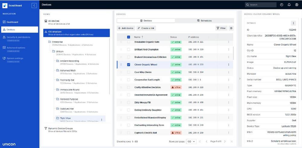 Diesen Herbst zeigt Unicon die nächste Evolutionsstufe betriebsumfassender Endpoint-Verwaltung. Das Unternehmen spendiert seiner bewährten „Scout Console“ eine neue webbasierte Verwaltungs-Lösung. Scout Board kommt in neuem Look and Feel und basiert auf aktuellsten intuitiven UI/UX-Konzepten für Organisationsmanagement und Geräteverwaltung. Das neue Funktionspaket nutzt dabei bestehende Scout-Server und dazugehörige Datenbanken, sodass die Inbetriebnahme schnell und unkompliziert vonstatten geht. Es besteht keine Notwendigkeit, Konfigurationen, Berechtigungen, etc. anzufassen oder zu konfigurieren.