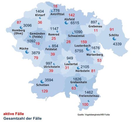 95 neue Corona-Fälle meldet das Gesundheitsamt des Vogelsbergkreises am Mittwoch. 57 Genesenenmeldungen sind bei der Behörde registriert worden, sodass dort aktuell 1.230 aktive Fälle betreut werden. Für das Kreisgebiet weist das Robert-Koch-Institut (RKI) eine Sieben-Tage-Inzidenz von 386,7 aus. Hessenweit liegt der Wert bei 359,7. Die Sieben-Tage-Inzidenz der Hospitalisierungen in Hessen liegt bei 3,97. Die Übersicht […]