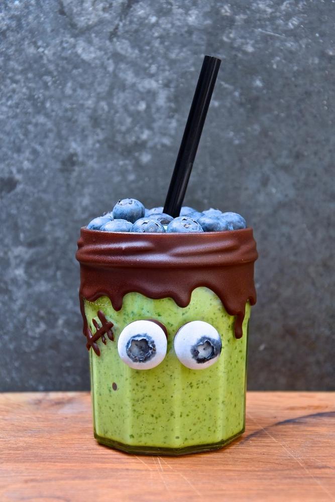 Dieser vitaminreiche Smoothie ist eine Neuinterpretation des Frankenstein-Monsters, komplett mit Blaubeergehirn.
