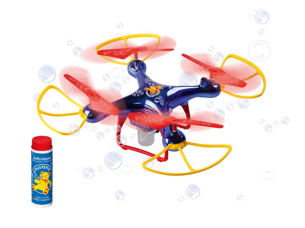 Seifenblasen aus der Luft! Der innovative Revell Control Bubble Copter sorgt nicht nur auf allen Events und Feiern für die richtige Stimmung, sondern auch bei Spaß im Garten oder im Park, denn er füllt die Luft mit schimmernden Seifenblasen von PUSTEFIX. Der ca. 28 cm lange Quadrocopter wird einfach mit der hochwertigen Seifenblasenflüssigkeit nach dem Original PUSTEFIX-Rezept gefüllt und erzeugt auf Knopfdruck schillernde Blasen. Natürlich ist er im Design des Kult-Seifenblasenherstellers mit dem Teddy gestaltet.