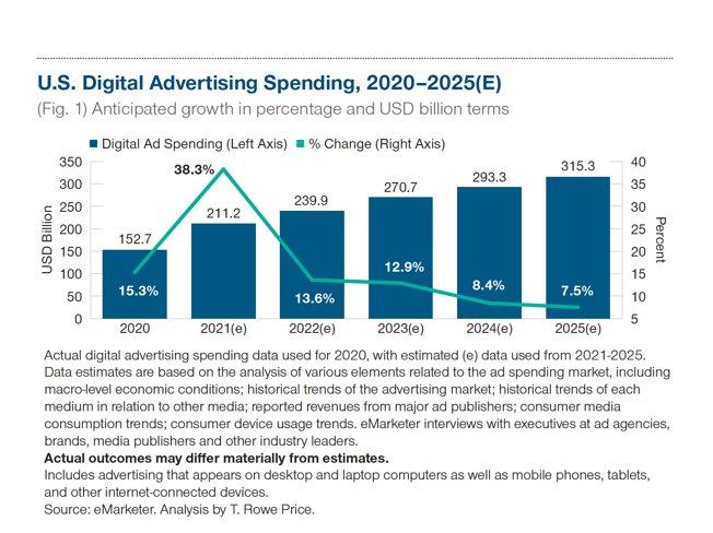 Der starke Rückenwind, der das rasante Wachstum der digitalen Werbung in den letzten zehn Jahren begünstigt hat – wachsende Internetverbreitung, steigende Beliebtheit von Smartphones, zunehmende Nutzung sozialer Medien, steigende Verbreitung von E-Commerce, zunehmende Investitionen in Technologie und digitale Plattformen – ist weitgehend intakt, und es ist derselbe Rückenwind, der das Wachstum auch in Zukunft stützen dürfte. Diese säkularen Trends zeigen keine Anzeichen einer Abschwächung, als dies in den letzten zehn Jahren der Fall war. Wir gehen davon aus, dass die digitale Werbung auch in den kommenden Jahren andere Medienformen übertreffen wird.