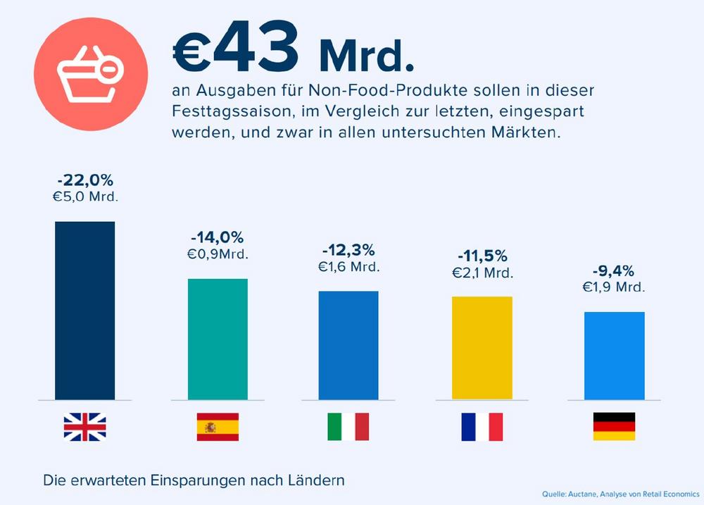 In den acht untersuchten Märkten (Australien, Deutschland, Frankreich, Großbritannien, USA, Italien, Kanada und Spanien) zeigt der Report, dass im Laufe des Weihnachtsgeschäfts 2022 voraussichtlich über 43,2 Milliarden Euro weniger (durchschnittlich 13,7 Prozent) für Non-Food-Artikel ausgegeben werden als im Vorjahr – das entspricht auch den Ergebnissen in den Europäischen ländern (durchschnittlich 13,8 Prozent). Laut Bericht werden diese Länder im Vergleich zu 2021 11,7 Milliarden Euro weniger für Geschenke ausgeben. Zu den Beweggründen gehören besonders der Anstieg der Inflation und die wachsende wirtschaftliche Unsicherheit. Laut Studie werden die deutschen Verbraucher in der Vorweihnachtszeit rund 1,9 Milliarden Euro weniger ausgeben als im Vorjahr. Mit einer erwarteten Reduktion der Ausgaben um nur 9,4 Prozent zeigen deutsche Verbrauchen im Europa-Vergleich jedoch trotzdem die höchste Resilienz. Beispielsweise in Großbritannien (-22 Prozent) oder Spanien (-14 Prozent) fällt die Prognose weit ernüchternder aus. Und immerhin geben hierzulande mehr als die Hälfte (52,9 Prozent) der Befragten an, aktuell noch keine Einsparungen in der Weihnachtszeit zu planen.