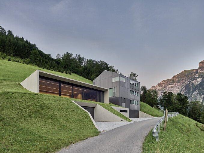 Der oberhalb der Erschließungsebene freistehende Ergänzungsbau ordnet sich formal der Bestandsarchitektur sowie der umgebenden Natur unter. Tief in den grün bewachsenen Wiesenhang gräbt sich die neue Betonstruktur ein. Die trichterförmige Zufahrt mündet in einem schwarzen Garagentor aus Metall, was einen farblichen Bezug zur dunklen Fassade des Haupthauses darstellt. Die beiden Baukörper sind unterirdisch entlang der durchgehenden Stützmauer miteinander verbunden. Oberhalb der neuen Parkgarage baut sich schließlich ein quaderförmiger Rahmen in hellem Sichtbeton auf. Das Material wiederholt sich entlang der Stützwände auf Straßenebene und deutlich auch im Innenraum. Die auffälligste Komponente am Neubau stellt eine über die gesamte Länge verlaufende Panoramaverglasung dar. Schmale, dunkle Profile trennen hier Schiebeelemente und festverglaste Segmente, die allesamt zum außergewöhnlichen Außenraumbezug beitragen. Mit Blick in südlicher Talrichtung tritt der neue Wohn- und Parkraum in den Dialog mit der Natur- und Dorflandschaft des Bregenzerwaldes sowie mit teils hochalpinen Bergmassiven wie der Kanisfluh.