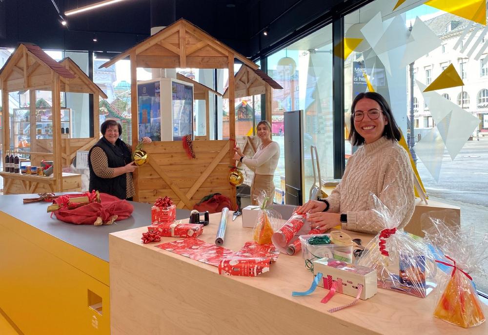 „Letztes Jahr kam unsere feierlich geschmückte Tourist-Info schon sehr gut bei den Gästen an und hat Vorfreude auf Weihnachten geweckt. Auch jetzt packen wieder alle mit an, um unserem Schaufenster das zauberhafte Ambiente zu verleihen.“, erzählt Susanne Wolf, Leiterin der Tourist-Information, beim Schnüren der Geschenke, die später das Schaufenster zieren werden.