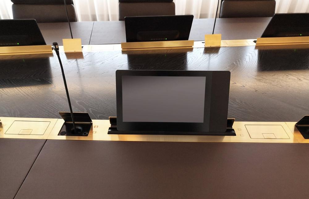 Die Halterahmen der im Tisch versenkbaren CONVERS- oder FOLD!-Touch-Monitore von ELEMENT ONE sind immer gleich tief, ebenso wie die des SOCKET-X-Anschlussfeldes und des Mirkofonlifts CONMIC. „Daher sind wir in der Lage, unsere Geräte auch komplett kombiniert zu liefern und individuelle Kundenwünsche hinsichtlich Ausstattung und Oberflächendesign zu berücksichtigen.“ Das Ergebnis ist ein sogenanntes „Silverline“-Gerät.