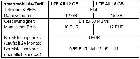 Wer sich jetzt für einen monatlich kündbaren Tarif von smartmobil.de entscheidet, kann auch beim Bereitstellungspreis sparen. Dieser wird für kurze Zeit von 19,99 EUR auf 9,99 EUR reduziert.