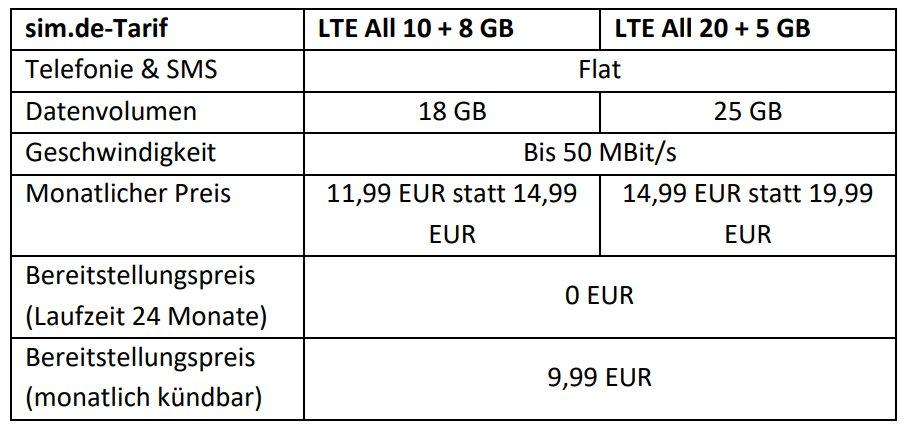 Ab sofort gibt es den BLACK DEAL LTE All 10 + 8 GB für 11,99 EUR statt 14,99 EUR pro Monat. Für Schnäppchenjägerinnen und -jäger mit einem noch höheren Bedarf an mobilem Datenvolumen hält sim.de ein weiteres Angebot bereit: Für kurze Zeit gibt es den Aktionstarif LTE All 20 + 5 GB für 14,99 EUR monatlich. Damit ist mit insgesamt 25 GB Datenvolumen pro Monat mobiles Surfen jederzeit ohne Einschränkung möglich.