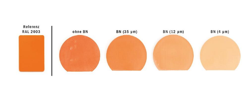 Neben einer satten Farbe bringt der Einsatz großer BN-Partikel weitere Vorteile. Die Verarbeitung wird durch einen geringeren Viskositätsanstieg des Compounds erleichtert und die Wärmeleitfähigkeit nimmt mit größerem Aspektverhältnis zu. Außerdem ist davon auszugehen, dass sich die mechanischen und elektrischen Eigenschaften bei Verwendung von größeren Partikeln ebenfalls verbessern. Diese Einflüsse müssen jedoch noch verifiziert und untersucht werden.