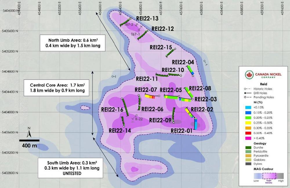 Diese Pressemitteilung enthält ein Update zu den Analyseergebnissen aus fünf weiteren Bohrungen, sodass jetzt insgesamt acht Bohrungen mit vollständigen Analyseergebnissen vorliegen. Die wahren Mächtigkeiten sind zu diesem Zeitpunkt noch nicht bekannt. Bohrung REI22-07 begann in der Nähe des Zentrums der Anomalie in Dunit, der eine Reihe von später entstandenen Intrusionsgängen enthält, und blieb bis zum Bohrungsende in einem stark serpentinisierten, mäßig bis stark mineralisierten Dunit. Die Bohrung wies einen durchschnittlichen Nickelgehalt von 0,29 % über 325,5 Meter auf, einschließlich eines mächtigen höhergradigen Abschnitts mit 0,35 % Nickel über 81,5 Meter. Die Bohrung durchteufte dann mineralisierten Dunit, der auf den letzten 132 Metern der Bohrung durchschnittlich 0,27 % Nickel enthielt.