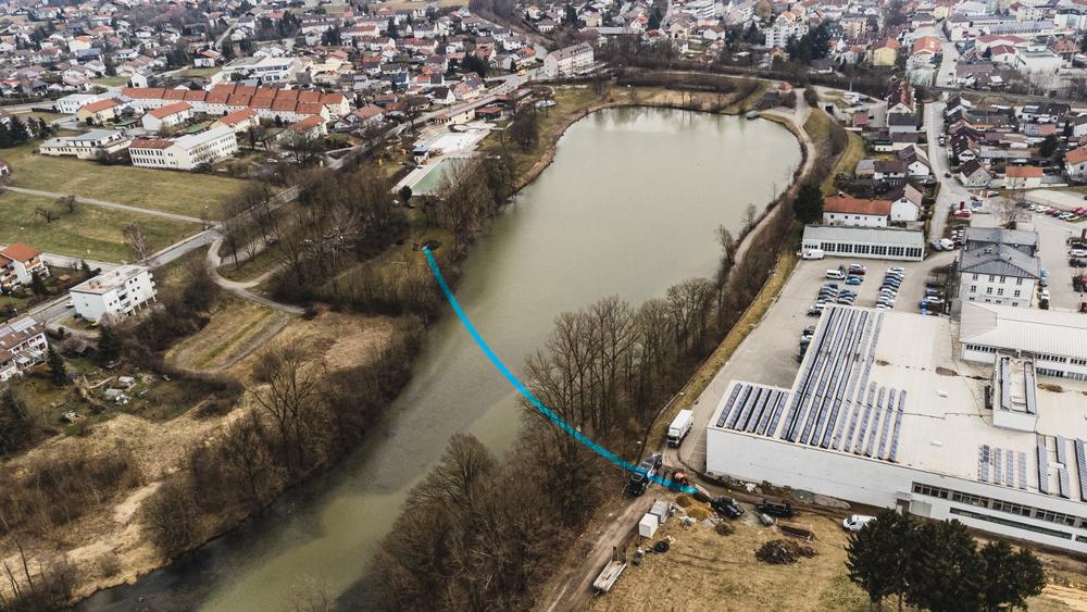 Die Bauarbeiten starteten im November, bereits Anfang März 2022 wurde der Wärmespeicher installiert, Mitte März begann der Bau der Fernwärmeleitungen. Der erste Abschnitt war auch gleich der dringlichste: die Anschlussleitung an das Freibad, da schon in der Saison 2022 das Freibadwasser mit „der neuen Fernwärme“ beheizt werden soll. Der kürzeste, zum Schutz von Umwelt und Natur sinnvollste, aber auch wirtschaftlich günstigste Verlauf für diese Fernwärme-Anschlussleitung an das Freibad, führte ganz klar quer „über den Mertsee“. Und „direkt über“ den Stausee bedeutete natürlich aus technischer Sicht „direkt drunter weg“, also im grabenlosen Horizontalspülbohrverfahren. Ein konventioneller Bau im offenen Graben stand gar nicht erst zur Diskussion.