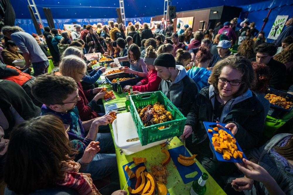 Rund ein Drittel aller erzeugten Lebensmittel erreicht nicht die Teller – vor dem Hintergrund weltweiter ökologischer und sozialer Krisen ist das aus Sicht von Slow Food ein beschämendes Ausmaß. Deswegen macht sich die Bewegung seit über zehn Jahren für die Wertschätzung von Lebensmitteln und deren Erzeuger*innen stark, unter anderem im Rahmen des „Wir haben es satt!“-Protests (WHES). Am Vorabend der Demonstration kommen Jung und Alt zusammen und verleihen ihrem Unmut Ausdruck. Sie bereiten aus optisch nicht marktfähigen, aber geschmacklich einwandfreien Gemüsen wie zweibeinigen Karotten und knubbeligen Kartoffeln Suppen zu, die am Abend selber und am darauffolgenden Tag während der Demonstration kostenlos verteilt werden. Unterstützt werden die Teilnehmenden dabei von Wam Kat und der Fläming Kitchen.