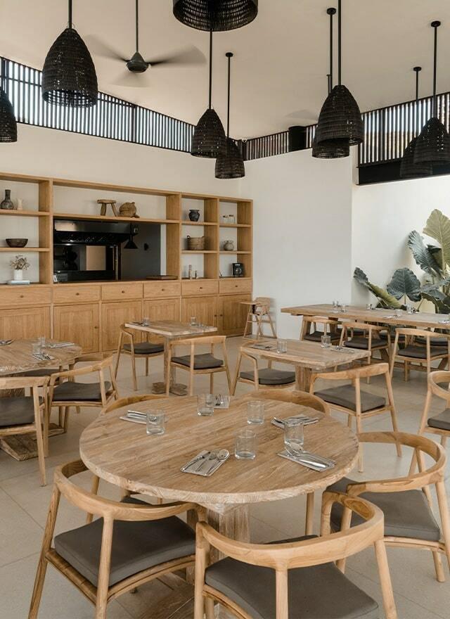 From the very start, the sisters have led this project on every level, from the business side to the creative elements. Once they secured a 6,300-square-meter plot atop a steep hillside with stunning views of Are Guling Bay and Prabu Village in the valley below, they created what is now a luxe nature hideaway with a restaurant, spa, and 20 independent villas. Here, contemporary living is defined by notions of responsibility, conservation, and sustainability; architecture finds inspiration in the natural surroundings; and guests can unwind and relax but also explore untouched landscapes and surf world-class waves.