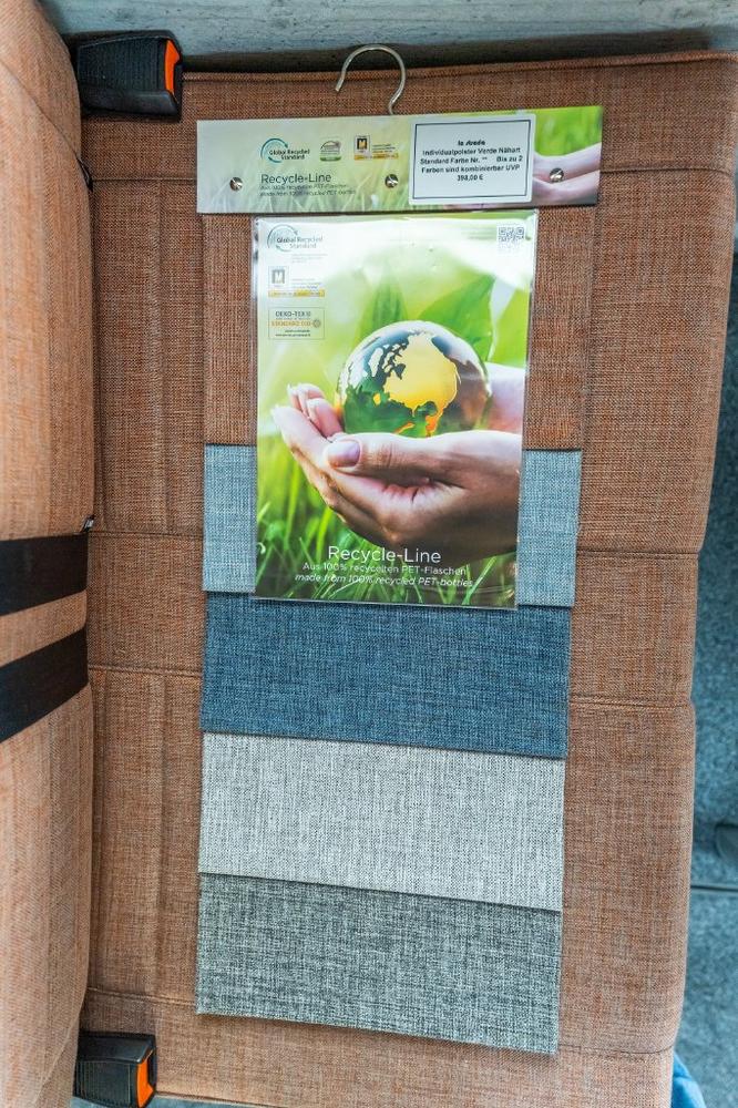 In der Herstellung der „Individualpolster Verde“ wird der Polyesterfaden zu 100 Prozent aus recycelten PET-Flaschen gewonnen. Diese werden dadurch einer sinnvollen Wiederverwertung zugeführt und landen nicht im Abfall. Das verringert die Umweltbelastung und reduziert zugleich die Abhängigkeit von neuen Erdölprodukten in der Stofffertigung. Der Polyesterfaden wird anschließend mit Stoffgarn verwebt und ergibt dadurch einen umweltfreundlichen, strapazierfähigen und leicht zu reinigenden Stoffbezug für Fahrerhaussitze und Sitzbank in allen Reisemobilen der la strada Fahrzeugbau GmbH.