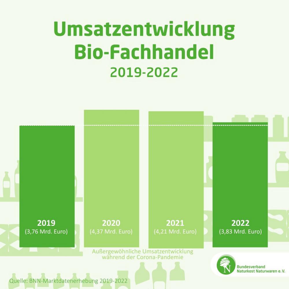 Der Angriffskrieg Russlands auf die Ukraine, die drastisch gestiegene Inflation sowie die steigenden Kosten bei Energie, Mobilität und Alltagsversorgung haben dazu geführt, dass die Verbraucher*innen beim Lebensmitteleinkauf deutlich preissensibler geworden sind. Hinzu kommt, dass die Verbraucher*innen nach dem Wegfall der meisten Corona-Maßnahmen wieder häufiger außerhalb der eigenen Wohnung etwa in Kantinen, Restaurants oder auf Urlaubsreisen konsumieren, wo sie oft keine Bio-Option bei Lebensmitteln haben. Die Vorjahre 2021 (4,21 Milliarden Euro) und 2020 (4,37 Milliarden Euro) sind coronabedingte Ausnahmejahre, in denen die Umsätze im Biofachhandel aufgrund von Lockdowns sowie Einschränkungen in Gastronomie und Tourismus um bis zu 16 Prozent über dem Umsatz von 2019 (3,76 Milliarden Euro) gelegen haben.