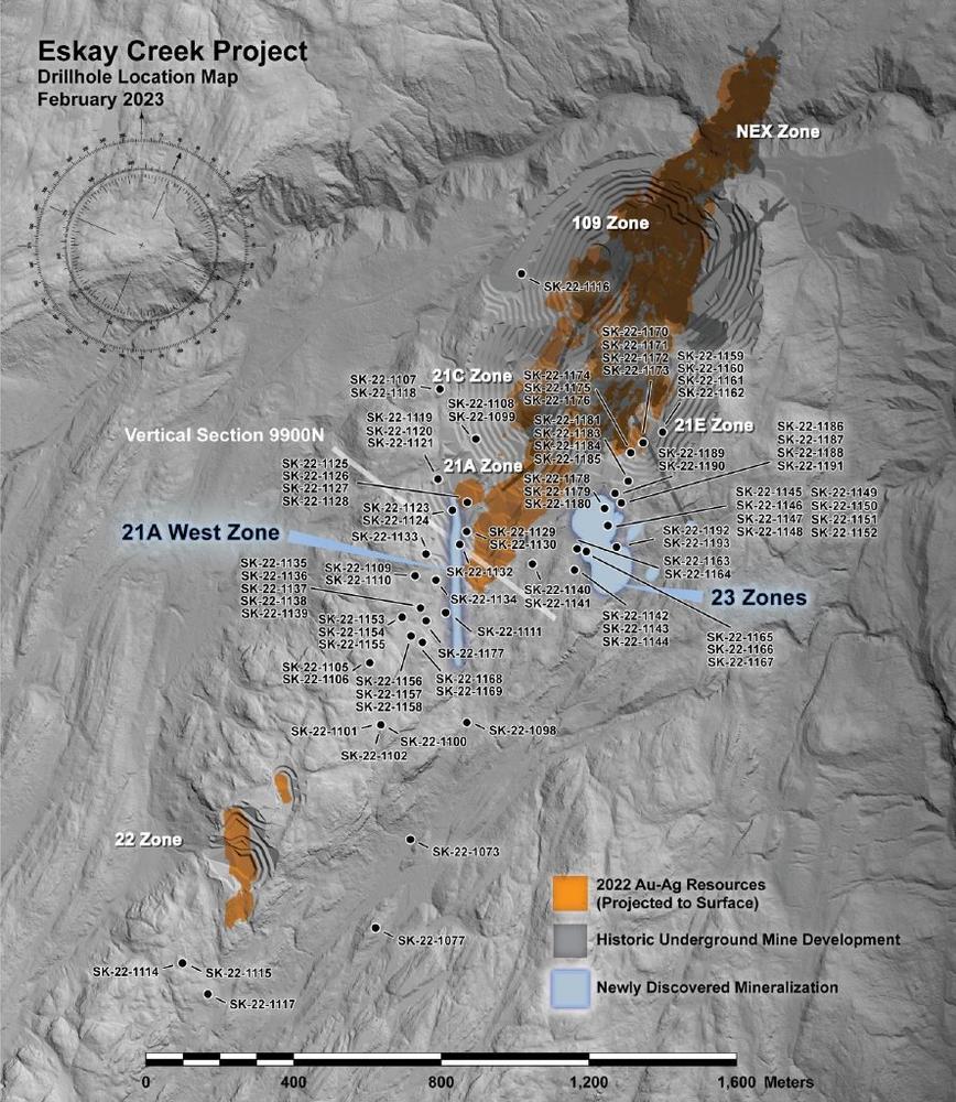 An additional extension to the south end of the 21A West Zone just beyond the Feasibility Study pit limits and only 10 metres below surface was completed by drill hole SK-22-1177, averaging 14.90 g/t Au, 2.5 g/t Ag over 5.70 m. This new expansion occurs 100 metres vertically up-dip of previously reported drill hole SK-22-1028, which intersected 1.74 g/t Au, 1.7 g/t Ag over 46.77 m. The space between the two drill holes remains untested.