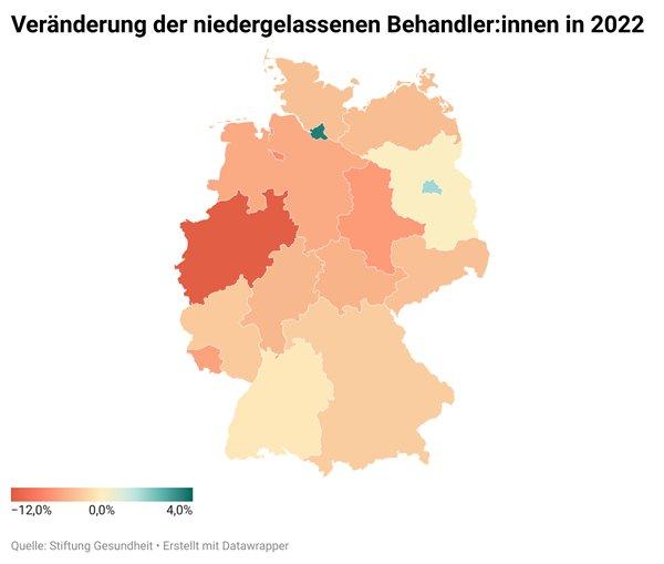 „Die Zahl der niedergelassenen Ärztinnen und Ärzte ist im Laufe des Jahres 2022 in allen Bundesländern mit Ausnahme von Hamburg und Berlin gesunken“, berichtet Christoph Dippe, CEO der Stiftung Gesundheit. Den stärksten Rückgang gab es in Nordrhein-Westfalen mit einem Minus von 19,0 Prozent. Das entspricht in etwa 4.700 Ärzten, die nicht in eigener Praxis tätig sind.