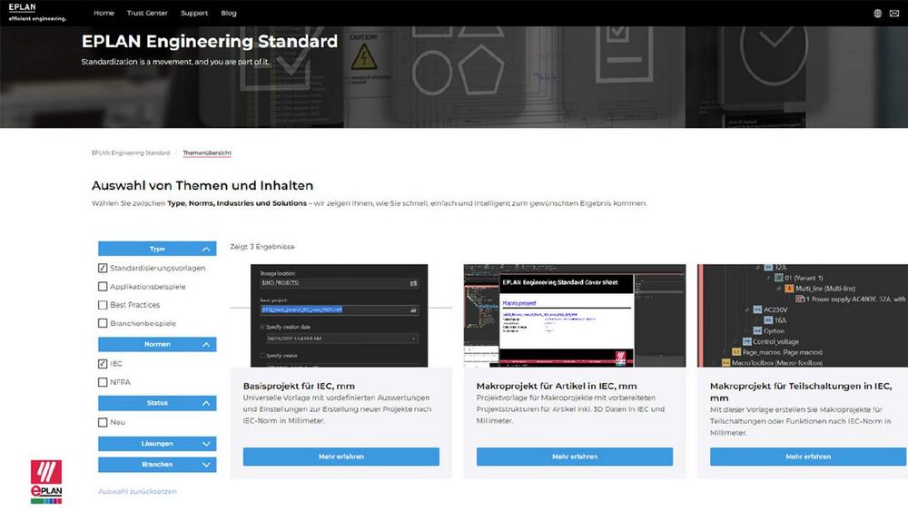 Mit dem EPLAN Engineering Standard greifen (Erst-)Anwender auf Beispieldaten und -vorlagen zu, die einfache Standards im Projekt ermöglichen. Dazu gehören etwa Leitfäden für die richtige Installation der EPLAN Plattform, standardisierte Basis- oder Makro-Projektvorlagen, Projektierungsbeispiele zu typischen Aufgaben mit EPLAN und branchenspezifische Best Practices. Tom Wolff, Head of EPLAN Engineering Standard, erklärt: „Mit dem EPLAN Engineering Standard geben wir unseren Kunden praktische Hilfestellung, die auf standardisierten Daten und Abläufen basiert und die Nutzung der Software hocheffizient macht. Mit diesen Services wird die Projektierung für unsere Anwender zum Start enorm erleichtert.“ Das gilt sowohl für Einsteiger als auch für erfahrene Anwender, da sie die Software effizienter auf- und einsetzen können und zugleich Hilfestellung bei selten genutzten Anwendungsfällen erhalten.