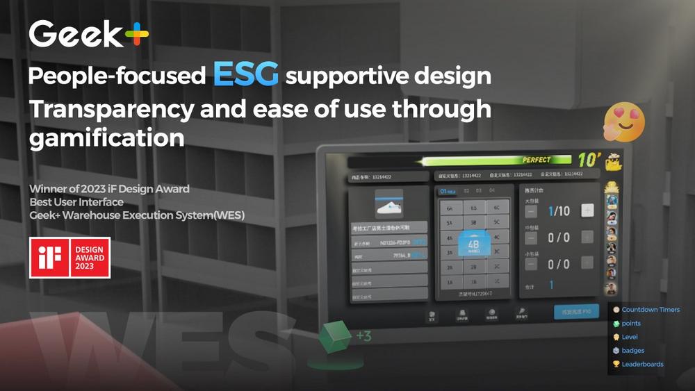 The Geekplus WES is a warehouse task execution system that goes beyond task scheduling to optimize and balance the collaboration between multiple automated units. The system incorporates ideas and theories of gamification to make it easy and enjoyable for warehouse employees to use, a key principle of sustainable design. The WES has been applied in several industries including, e-commerce, pharmaceuticals, and the automotive industries, among others.