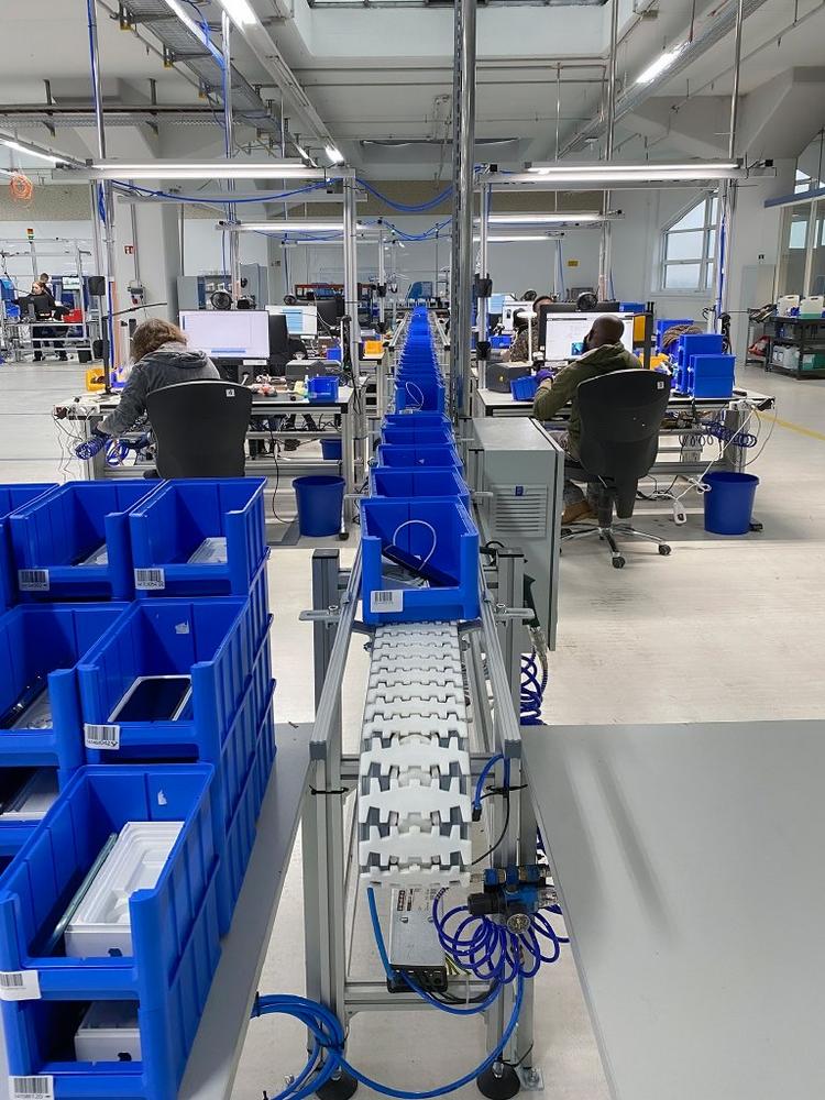 Am Standort Falkensee werden die angelieferten Smartphones in Sichtlagerkästen durch die gesamte Verarbeitung transportiert. So bleiben alle Zubehörteile zusammen und die Smartphones können mit einem Barcode am Kasten jederzeit eindeutig zugeordnet werden. Das Versaflex Fördersystem sollte die Kästen vom Wareneingang als Pufferstrecke zur nächsten Station fördern, bei der die Smartphones geladen und die Software zurückgesetzt wird. Ein weiteres Versaflex Fördersystem wurde benötigt, um die Kästen in den Gradingbereich mit den manuellen Arbeitsplätzen zu transportieren. Hier werden die Sichtlagerkästen durch die Mitarbeiter:innen vom Fördersystem abgenommen und die Smartphones manuell gereinigt und überprüft. Nach dem Bearbeiten müssen die Kästen dann zur automatisierten Prüfung weiter transportiert werden. Wichtig war, dass die Sichtlagerkästen nach der manuellen Prüfung nicht wieder in denselben Förderstrang zurückgestellt werden. Es musste eine eindeutige Trennung zwischen ungeprüften und geprüften Smartphones geben. Dazu wurde das Versaflex Fördersystem doppelstöckig ausgeführt.