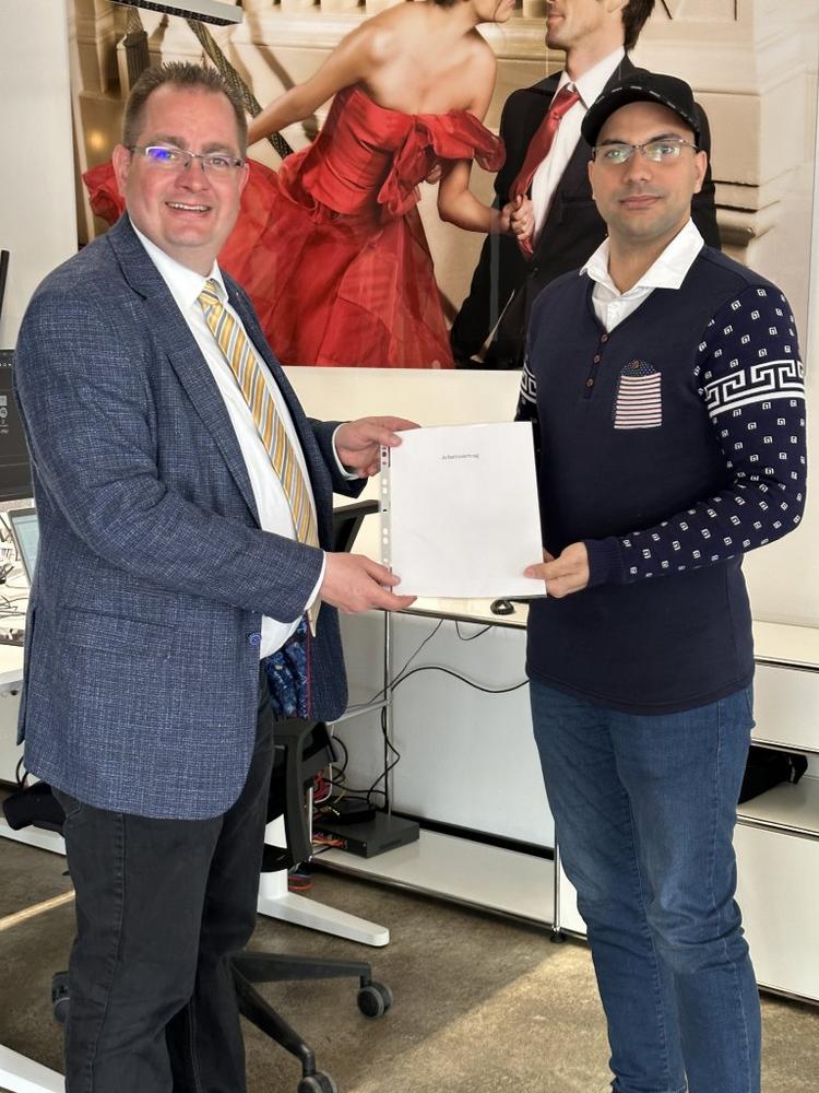 Herr Steinraths übergab Herrn Mobin während seines Besuchs persönlich seinen ersten Arbeitsvertrag in Deutschland. Herr Mobin bedankte sich bei ihm und betonte, wie dankbar er für die Unterstützung von Tie Solution und die Chance sei, in Deutschland arbeiten zu können.