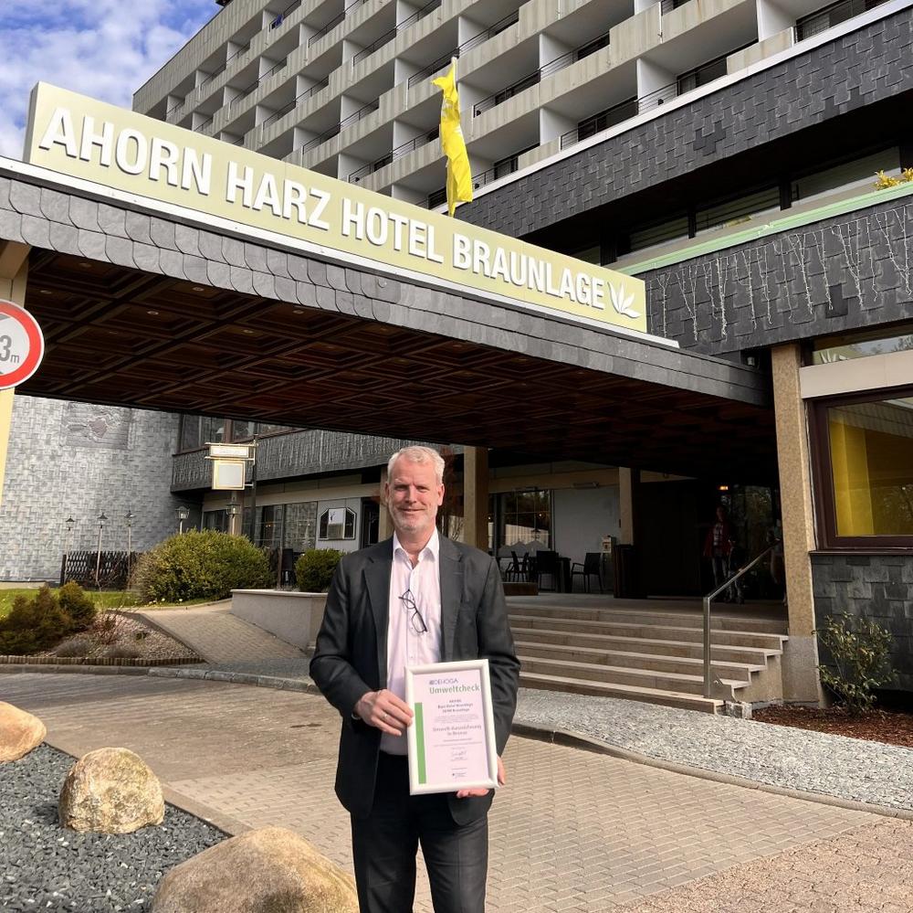 Unmittelbar nach der Übernahme des Traditionshotels in Braunlage im Oktober 2021 hat das familiengeführte Unternehmen mit der Modernisierung in allen Hotelbereichen begonnen. Dabei wurde von Anfang an großer Wert auf ökologische Nachhaltigkeit gelegt. Unter anderem wurde die gesamte Beleuchtung des Hotels auf energiesparende LED-Technik umgestellt. Das neue Blockheizkraftwerk zur Eigenstromerzeugung wurde zur Energieeinsparung in Verbindung mit einer modernen Gebäude-Leittechnik installiert. Wie in den weiteren AHORN-Hotels wurde ein Monitoring-System installiert, um per Mausklick technische Vorgänge optimieren zu können. Weiterhin wurden Konzepte zur Müllvermeidung und -trennung und Wassersparmaßnahmen eingeführt. Das Hotel kauft nun bevorzugt regionale Produkte, um den ökologischen Fußabdruck zu minimieren und regionale Partner zu unterstützen. Neben der Verpflichtung zum Umweltschutz ermöglichen die Maßnahmen auch Einsparungen bei Energie und Wasser, um langfristig wirtschaftlicher zu arbeiten.