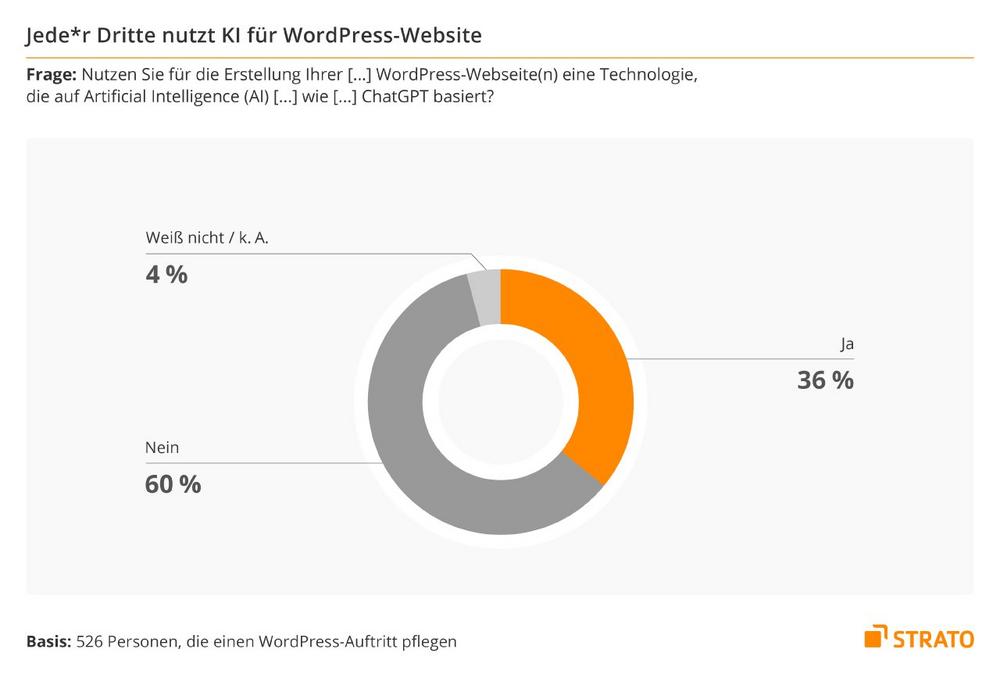 Für Website-Betreibende sind KI-Programme wie ChatGPT nicht mehr wegzudenken: Schon heute nutzen mehr als ein Drittel (36 Prozent) der WordPress-Anwender*innen ChatGPT und Co. für ihre WordPress-Website. Das zeigt eine aktuelle Studie des Webhosting-Anbieters STRATO zum 20. Geburtstag von WordPress am 27. Mai, für die über 500 WordPress-Anwender*innen befragt wurden. Bei denjenigen, die ChatGPT mit WordPress noch nicht nutzen (60 Prozent, 4 Prozent „Weiß nicht“), ist das große Interesse hierfür offenkundig: Gut zwei Drittel (68 Prozent) der Nicht-Nutzer*innen können sich die Nutzung ganz konkret vorstellen