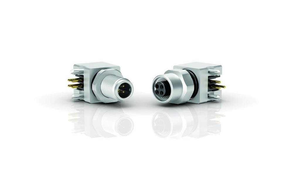binder, a leading supplier of industrial circular connectors, presents compact angled panel mount parts in M5 size. The 3- or 4-pin connectors of the 707 series are equipped with dip solder contacts for PCB mounting, and screw locking ensures reliability of the connection. Mated and locked, the interface complies with protection degree IP68.