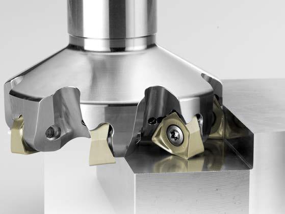 Die einzigartigen Hartmetall-WSP verfügen über sechs nutzbare Schneidkanten, die dank einer negativen Geometrie für Kosteneinsparungen und eine ausgezeichnete Bearbeitungszuverlässigkeit sorgen und dennoch ein scharfes positives Zerspanen ermöglichen.Dies sorgt für geringe Schnittkräfte. Eine höhere WSP-Dicke gegenüber herkömmlichen Typen ermöglicht eine ausgezeichnete Bruchfestigkeit und garantiert jederzeit ein verlässliches Bearbeitungsergebnis. Darüber hinaus ermöglicht eine große maximale Schnitttiefe von bis zu 8 mm ein effizientes Schulterfräsen. Um die Erwartungen an die Oberflächengüte der Werkstücke zu erfüllen, weist die Stirn aller WSP eine Geometrie mit großem Radius auf, die wie ein traditioneller Wiper arbeitet.