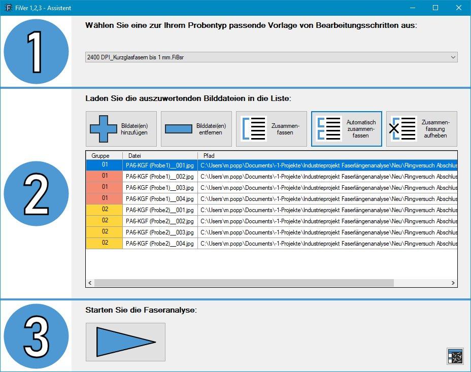 Die Weiterentwicklung von FiVer zu „V2“ erfolgte am SKZ in enger Zusammenarbeit mit der Industrie und auf Basis unzähliger Messungen. Die systematische Sammlung von Fragen und Anregungen seit dem Launch vor zehn Jahren ermöglichte es außerdem, Verbesserungspotentiale zur Erhöhung der Präzision bei gleichzeitiger Reduzierung von Streuungen zu erarbeiten. Lange, gebogene und überkreuzt liegende Fasern werden nun dank verbesserter Algorithmen noch zuverlässiger automatisch erkannt. Die Präzision der Ergebnisse steigt durch erweiterte Bildaufbereitungs- und Kalibriermöglichkeiten deutlich. Die entscheidendste Neuerung ist jedoch der Analyse-Autopilot, der sogenannte „FiVer 1, 2, 3 – Assistent“, mit dem die notwendigen Auswertungsschritte für eine Liste von Probenscans automatisiert abgearbeitet werden können. Dabei kommt eine maximal vereinfachte, alternative Benutzeroberfläche zum Einsatz, die mit lediglich drei schnellen Klicks zum Ziel führt.