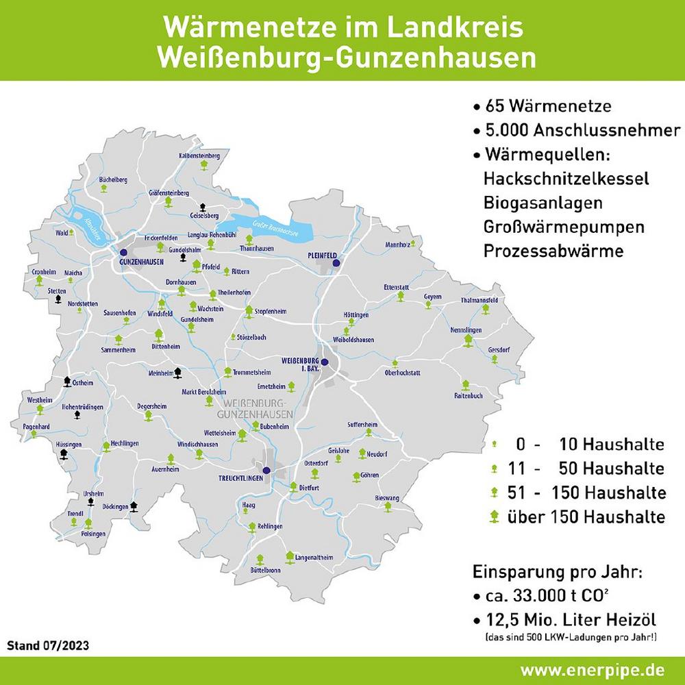 Im südlichen Franken wird neben der klassischen Verwertung von Waldhackschnitzeln auch die Prozessabwärme von Industriebetrieben genutzt. Hierbei wird beispielsweise die Prozessabwärme aus der Bierproduktion in das Nahwärmenetz eingespeist. Des Weiteren wird die Abwärme der Biogas-BHKW’s verwendet, wobei es nicht selten vorkommt, dass eine Biogasanlage mehrere Wärmenetze gleichzeitig versorgt. Auch der Einsatz von Großwärmepumpen in Wärmenetzen findet im Landkreis Weißenburg-Gunzenhausen statt.