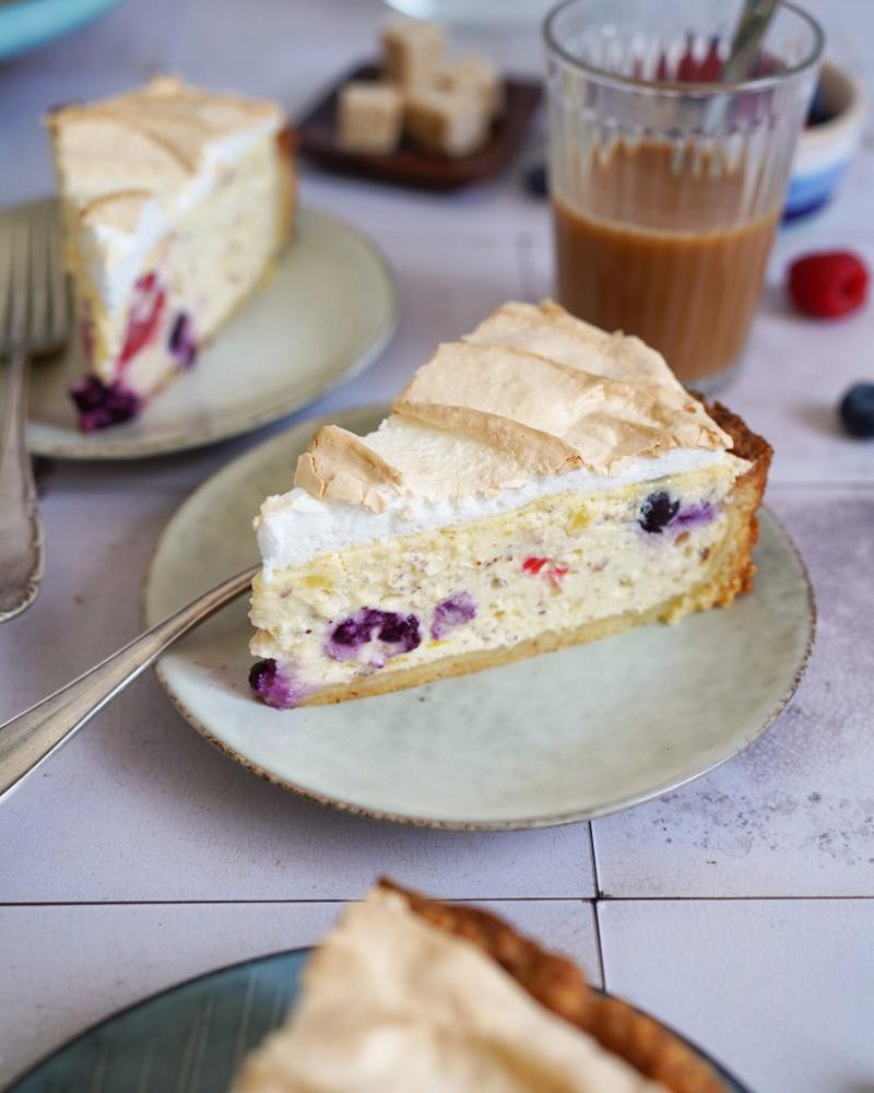 Für die Füllung 750 Gramm Magerquark mit 200 Gramm Frischkäse und 100 Gramm Zucker verrühren. Drei Eigelbe dazugeben und alles gut vermengen. 50 Gramm gemahlene Haselnüsse und zerstampfte, abgekühlte Kartoffeln dazugeben und unterrühren. Als Letztes 100 Gramm Himbeeren und 50 Gramm Blaubeeren dazugeben und vorsichtig unterheben, damit die Beeren nicht zerdrückt werden. Die Masse auf dem vorgebackenen Boden verteilen und glattstreichen. Im Ofen für etwa 25 Minuten backen.