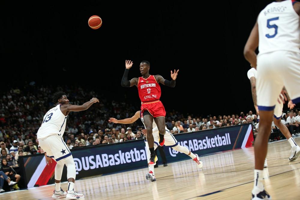 Die deutsche Mannschaft trat heute ohne Justus Hollatz an. Der Point Guard wird aber mit zum World Cup reisen. Die medizinische Abteilung schaut von Tag zu Tag, was geht, und das in enger Absprache mit den Coaches. Mit unveränderter Startformation (Dennis Schröder, Andreas Obst, Franz Wagner, Daniel Theis, Johannes Voigtmann) lief Deutschland auf. Die USA legte mit viel Tempo los und nutzte die körperliche Überlegenheit u.a. durch einige mächtige „Block Shots“ aus. Das DBB-Team kam vor allem über Theis zu guten Würfen, aber noch fiel nicht viel (9:15, 5.). Dann swishte Obst einen Dreier und eine muntere und kurzweilige Anfangsphase war schon vorüber (12:15). Der stark beginnende Voigtmann glich per Dreier aus und brachte Deutschland an der Freiwurflinie erstmals in Front (17:15, 6.). Auf US-Seite agierte Anthony Edwards am auffälligsten. Rotzfrech netzte Obst einen Dreier in Transition zum 22:21 (8.), nachdem zuvor ein glasklares klares „Goal Tending“ gegen Voigtmann nicht gepfiffen worden war. Die aggressive Verteidigung der DBB-Auswahl zeigte Wirkung, Deutschland war sehr gut im Spiel (26:24, 10.).