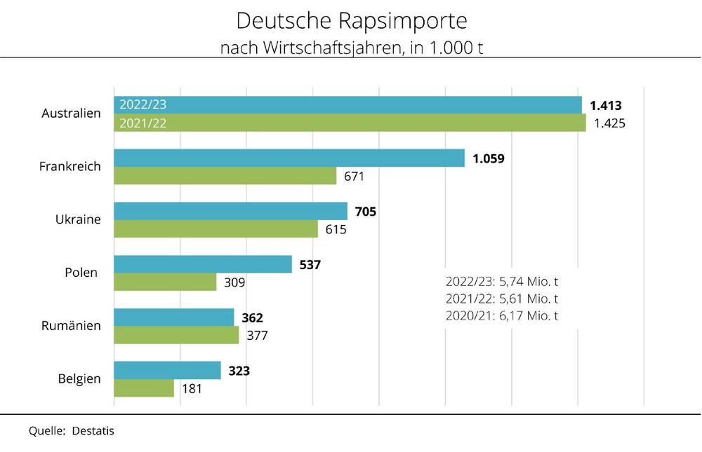 Deutschland hat im Wirtschaftsjahr 2022/23 rund 5,74 Mio. t Raps eingeführt und damit etwa 2 % mehr als in der vorangegangenen Vermarktungssaison – und dies, obwohl die Rapsernte 2022 umfangreicher ausfiel als noch im Jahr zuvor.
