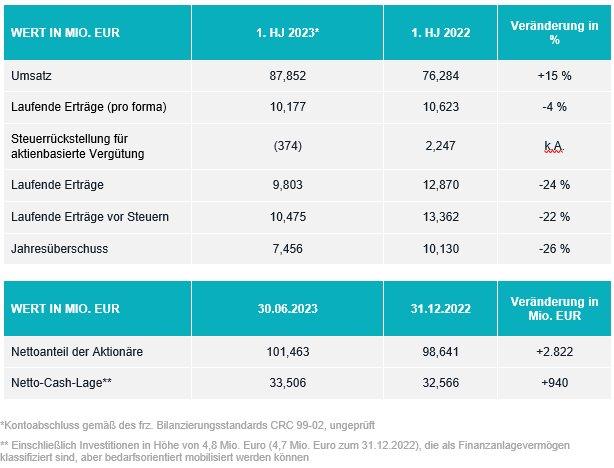 Die laufenden Erträge des ersten Halbjahres gingen im Vergleich zum Vorjahreszeitraum um 24 % zurück. Diese Veränderung ist hauptsächlich auf die Auflösung der Rückstellung für Steuern auf aktienbasierte Vergütungen in Frankreich (Arbeitgeberbeitrag) im Jahr 2022 zurückzuführen, die ursprünglich 2021 verbucht wurde. Änderungen dieser Rückstellung ergeben sich aus den jährlichen Aktienausschüttungen und vor allem aus den Schwankungen des Esker-Aktienkurses.