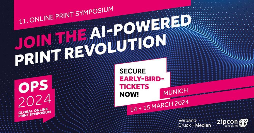 The Online Print Symposium is an annual event for the online print industry. Since 2013, the organisers zipcon consulting GmbH and the Bundesverband Druck und Medien have offered the symposium in Munich. With around 300 international visitors, a partner exhibition, evening events and two days of top-class presentations, the Online Print Symposium (OPS) has become the most important event in the industry. On 14 and 15 March 2024, OPS will take place for the 11th time in Munich under the motto "Join the AI-Powered Print Revolution".