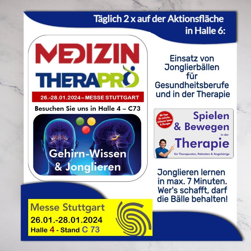 Am Messestand Gehirn-Wissen & Jonglieren in Halle 4 / C73 und zwei Mal täglich auf der Aktionsfläche in Halle 6 (E70) wird Stephan Ehlers den Messebesuchern erklären und selbst erleben lassen, warum das Jonglieren bzw. Wurf-/Fangübungen mit nur einem Ball bereits intensiv im Gehirn wirkt und Kognition und Koordination verbessern. Außerdem wird erklärt, wie Gesundheitsberufe einfache Wurf- und Fangübungen mit nur 1 und 2 Bällen wirksam in der Therapie einsetzen können.