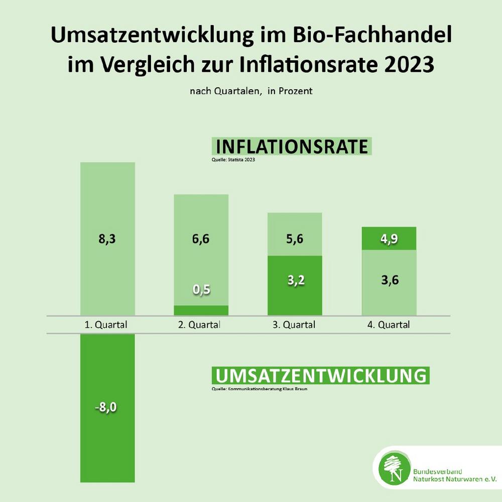 [1] Quelle: Klaus Braun Kommunikationsberatung, Entwicklung der Tagesumsätze im Naturkosteinzelhandel pro Quartal 2023 (im Vergleich zu 2022).
