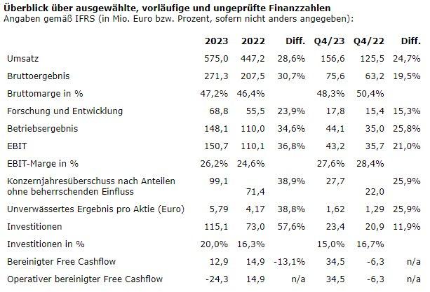 In einem herausfordernden wirtschaftlichen Umfeld und trotz einer spürbaren Entspannung in den weltweiten Lieferketten blieb die Nachfrage nach Elmos-Halbleitern auf einem guten Niveau. Der Konzernumsatz stieg nach vorläufigen, ungeprüften Zahlen auf 575,0 Mio. Euro (2022: 447,2 Mio. Euro) – das dritte Rekordhoch in Folge. Dies entspricht einer Steigerung gegenüber dem Vorjahr von 28,6% oder 127,8 Mio. Euro.