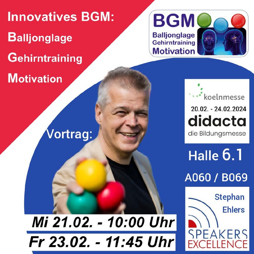 Wer das „neue BGM“ "live" in der Praxis erleben möchte, besucht den Vortrag von Stephan Ehlers auf der didacta in Köln beim Impulsforum „Zukunftsstrategien für Ihr Business“ von Speakers Excellence am