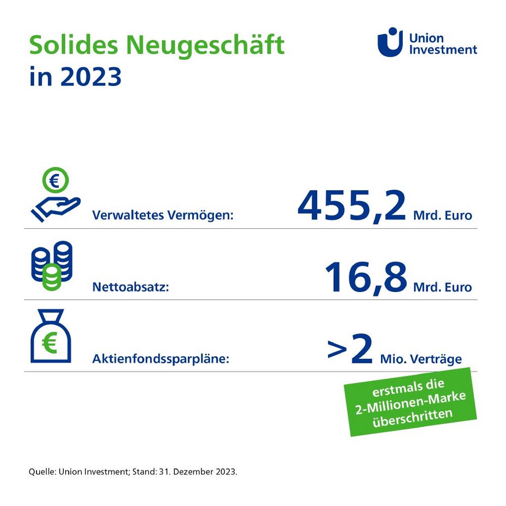 Union Investment hat das Geschäftsjahr 2023 trotz des schwierigen Umfelds für die Asset-Management-Branche gut gemeistert. Obwohl die Zinswende sowie die geopolitischen Spannungen die Kapitalmärkte prägten, lag der Nettoabsatz bei insgesamt 16,8 Milliarden Euro. Das ist einer der höchsten Zuflüsse in der Branche, auch wenn der Zustrom etwas geringer ausfiel als im Vorjahr (2022: 17,5 Mrd. Euro). Aufgrund des resilienten Neugeschäfts, der guten Fondsperformance und der insbesondere im vierten Quartal 2023 anziehenden Börsen stieg das verwaltete Vermögen auf einen neuen Höchststand von 455,2 Milliarden Euro (2022: 413,1 Mrd. Euro). Auch das Ergebnis vor Steuern machte mit 974 Millionen Euro einen deutlichen Sprung nach oben (2022: 694 Mio. Euro). Es ist damit das zweitbeste Resultat in der Unternehmensgeschichte. „Union Investment zählte auch 2023 zu den absatzstärksten Fondsgesellschaften in Deutschland und Europa. Damit haben wir unsere Marktposition in Deutschland erneut ausbauen können. Wir sind operativ gut unterwegs und haben die Zukunft fest im Blick“, sagte Hans Joachim Reinke, Vorstandsvorsitzender von Union Investment, bei der Jahrespressekonferenz der Fondsgesellschaft.