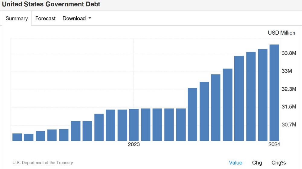 Um rund 4,5 Billionen US-Dollar stieg die amerikanische Staatsverschuldung allein im Jahr 2020 (Vgl. Abbildung 1). Die amerikanische Regierung verteilte sogar Blankoschecks an Staatsangehörige, die im Ausland lebten. Das alles, um die wirtschaftlichen Folgen der Coronakrise abzufangen. Die Folge war ein Anstieg der Inflation auf bis zu knapp 9 Prozent. Nachdem die Fed die Zinsen zu spät, dafür signifikant stark anhob, entspannte sich auch die Preisentwicklung wieder langsam. Diese konnte sich bis heute nicht dem Ziel von zwei Prozent annähern. Und das liegt an der Fortsetzung der äußerst spendablen Haushaltspolitik der amerikanischen Regierung. Diese nahm neue Schulden in Höhe von über 3 Billionen US-Dollar allein in den letzten 12 Monaten auf (Vgl. Abbildung 1). Die Staatsverschuldungsquote beläuft sich inzwischen auf 120 Prozent, was einem Anstieg von 10 Prozentpunkte innerhalb von nur 4 Jahren entspricht. Der Schuldenberg wird bald 35 Billionen US-Dollar betragen. Hält die Administration an dem derzeitigen Tempo fest, muss die amerikanische Wirtschaft jedes Quartal um über 2 Prozent wachsen, um die Staatsverschuldungsquote stabil zu halten. Ein äußerst unrealistisches Unterfangen, insbesondere auf lange Sicht.