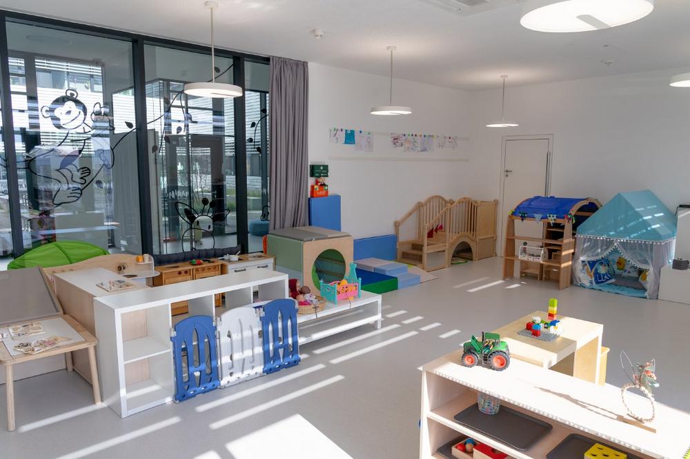 Im Januar 2023 war es so weit: Würzburgs erste unternehmenseigene Betriebs-Kita, die SKZ Kinderkrippe Kukis, nahm die ersten Kinder auf. 15 Kinder haben insgesamt Platz in der Krippe, die sich im Erdgeschoss der Modellfabrik des SKZ im Würzburger Stadtteil Lengfeld befindet und vom Bayerischen Roten Kreuz getragen wird. „Das Arbeiten bei den KuKis ist sehr besonders“, erzählt Einrichtungsleiterin Helene Hofmann. „Dadurch, dass wir nur eine Gruppe haben, ist alles sehr familiär. Alle kennen alle.“ Auch die Vernetzung mit den Mitarbeitern des SKZ schätze sie sehr. Für die Mitarbeiter wiederum sei es schön, sein Kind nahe bei sich zu wissen. Die Türen der KuKis sind teilweise verglast, sodass die Mitarbeiter direkte Einblicke in das bunte Treiben bekommen können. „Oft sehe ich Mitarbeiter und Besucher des SKZ strahlen, wenn sie unsere Kinder durch die Türen sehen“, sagt Helene Hofmann freudig.
